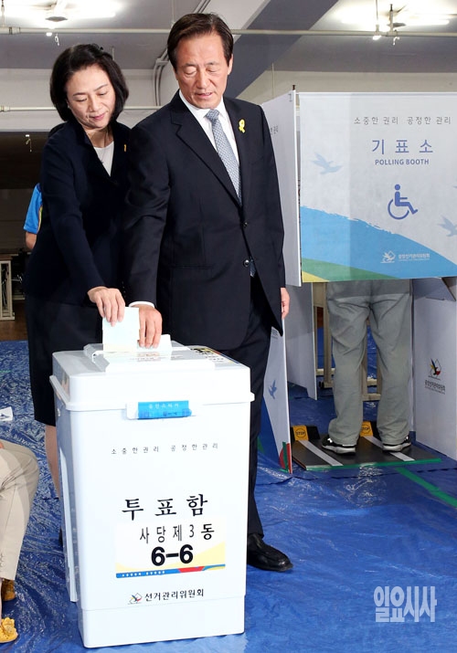 정몽준 새누리당 서울시장 후보가 4일 서울 동작구 사당동에 마련된 투표소에서 부인 김영명씨와 투표를 하고 있다.