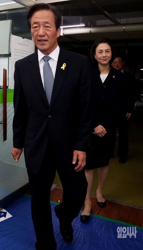 정몽준 새누리당 서울시장 후보가 4일 서울 동작구 사당동에 마련된 투표소에서 부인 김영명씨와 들어서고 있다.