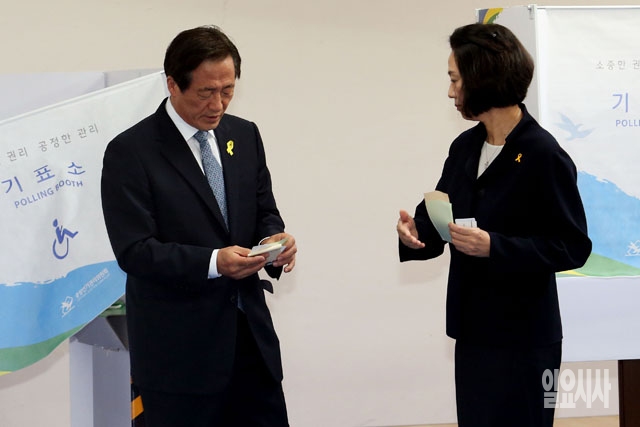 정몽준 새누리당 서울시장 후보가 4일 서울 동작구 사당동에 마련된 투표소에서 부인 김영명씨와 투표를 하고 있다.