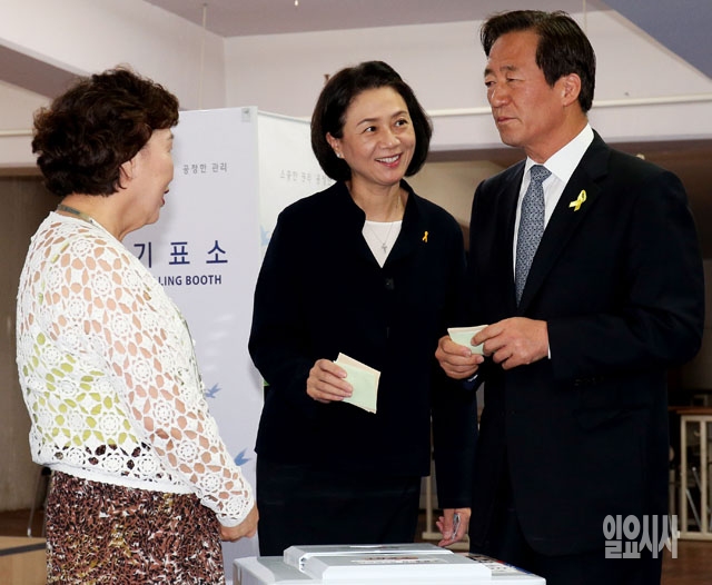 정몽준 새누리당 서울시장 후보가 4일 서울 동작구 사당동에 마련된 투표소에서 부인 김영명씨와 투표를 마친 뒤 투표사무원과 이야기를 나누고 있다.