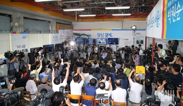 4일 서울 종로구 박원순 새정치민주연합 서울시장 후보 캠프에서 6.4 지방선거 출구조사가 박 후보의 당선 유력으로 발표되자 캠프 관계자들 및 지지자들이 환호하고 있다.