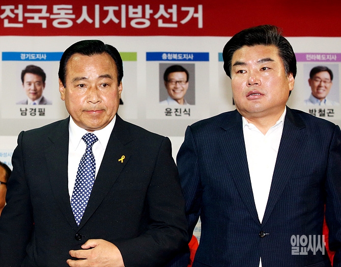 4일 오후, 이완구 원내대표와 원유철 의원이 서울 여의도 새누리당 당사에 마련된 선거상황실에서 개표상황을 지켜보던 중 굳은 표정을 지으며 퇴장하고 있다.