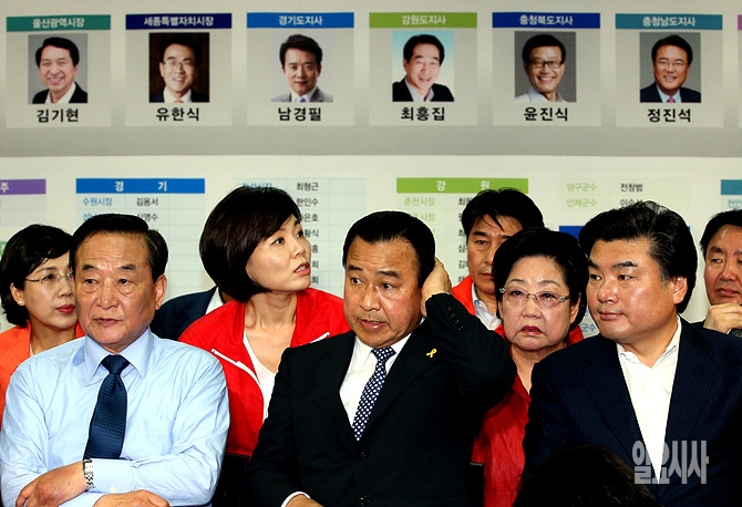 4일 오후, 이완구 원내대표와 서청원 의원 등이 서울 여의도 새누리당 당사에 마련된 선거상황실에서 개표상황을 지켜보며 어두운 표정들을 짓고 있다.