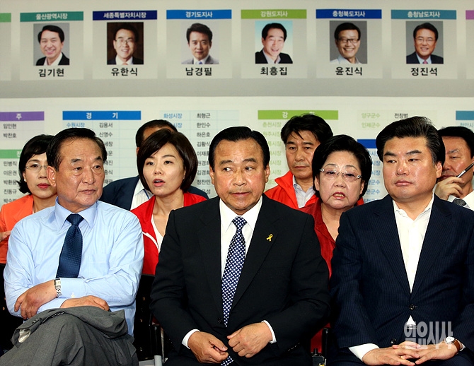 4일 오후, 이완구 원내대표와 서청원 의원이 서울 여의도 새누리당 당사에 마련된 선거상황실에서 개표상황을 지켜보면서 초조한 표정을 하고 있다.