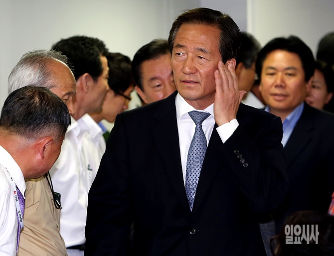4일 오후, 정몽준 새누리당 서울시장 후보가 서울 여의도 새누리당 당사에 마련된 선거상황실로 입장하면서 얼굴을 만지고 있다.