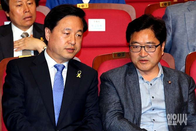 4일 오후, 김두관 새정치민주연합 공동선대위원장과 우원식 최고위원이 서울 여의도 국회 의원회관에 마련된 선거상황실에서 개표상황을 지켜보던 중 이야기를 나누고 있다.