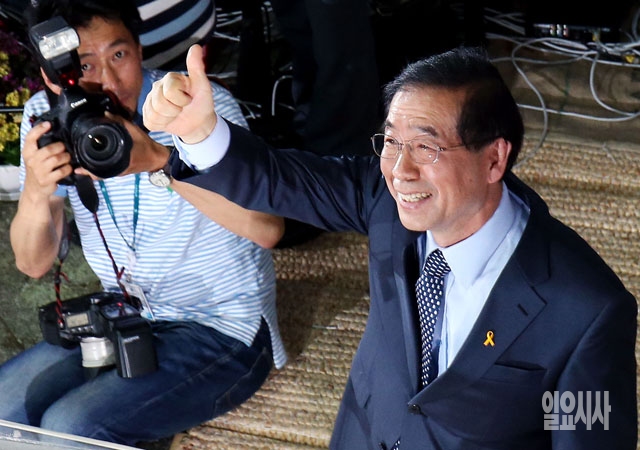 6.4 전국동시지방선거에서 서울시장 후보로 당선이 확실시 된 박원순 새정치민주연합 후보가 5일 오전 서울 종로구 선거캠프에서 지지자들에게 엄지 손가락을 치켜 들어 보이고 있다.