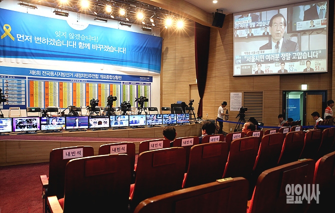 5일 새벽, 서울 여의도 국회 의원회관 대강당 새정치민주연합 선거개표상황실이 차려진 가운데, 대형 모니터에 박원순 후보의 당선 소감이 방송되고 있다.