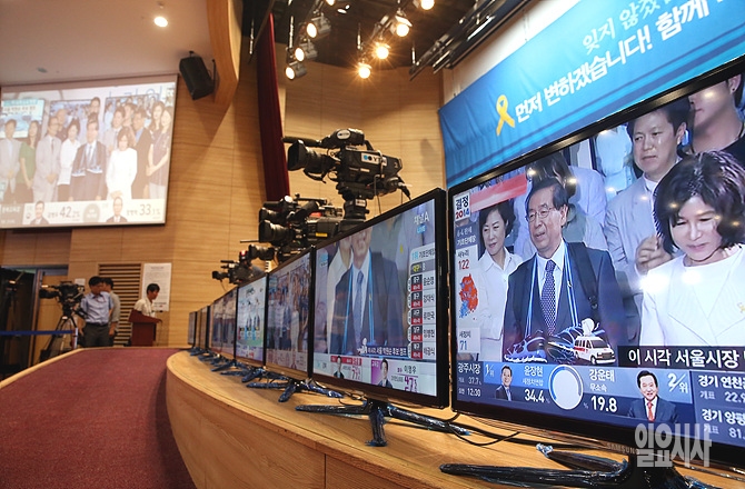 5일 새벽, 서울 여의도 국회 의원회관 대강당 새정치민주연합 선거개표상황실이 차려진 가운데, 개표방송이모니터를 통해 방송되고 있다.