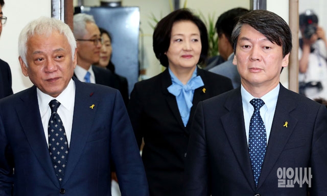 새정치민주연합 김한길(왼쪽), 안철수 공동대표와 박영선(가운데) 원내대표가 5일 서울 여의도 국회에서 열린 최고위원회의에 참석하고 있다.
