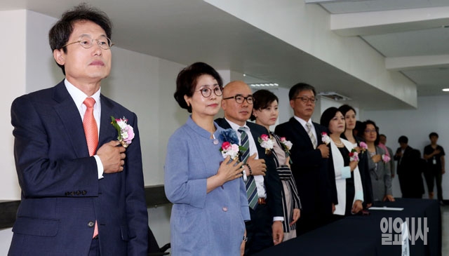 조희연 서울시 교육감 당선자(맨 왼쪽)가 5일 서울 종로구 서울시선거관리위원회에서 열린 제6회 전국동시자방선거 당선증 교부식에 참석, 비례대표시의원 당선자들과 국기에 대한 경례를 하고 있다.