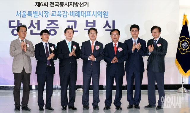 조희연 서울시 교육감 당선자(왼쪽에서 네번째)가 5일 서울 종로구 서울시선거관리위원회에서 열린 제6회 전국동시자방선거 당선증 교부식에서 이성호 위원장(세번째)을 비롯한 위원들과 기념촬영을 하고 있다.