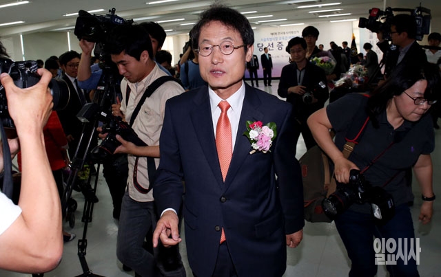 조희연 서울시 교육감 당선인이 5일 서울 종로구 서울시선거관리위원회에서 열린 제6회 전국동시자방선거 당선증 교부식을 마친 뒤 나서고 있다.