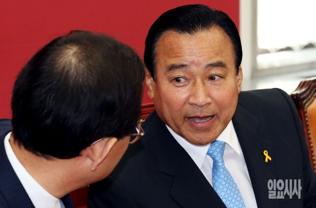 새누리당 이완구 비상대책위원장(오른쪽)과 주호영 정책위의장이 9일 서울 여의도 국회에서 열린 비상대책위원회의에서 대화를 나누고 있다.