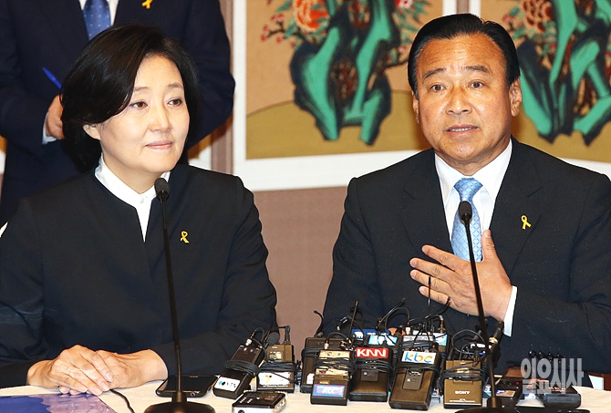 9일 오전, 새누리당 이완구(사진 오른쪽)·새정치민주연합 박영선 원내대표가 서울 여의도 국회 사랑재에서 원내대표 회동을 가진 가운데, 이 원내대표가 발언하고 있다.