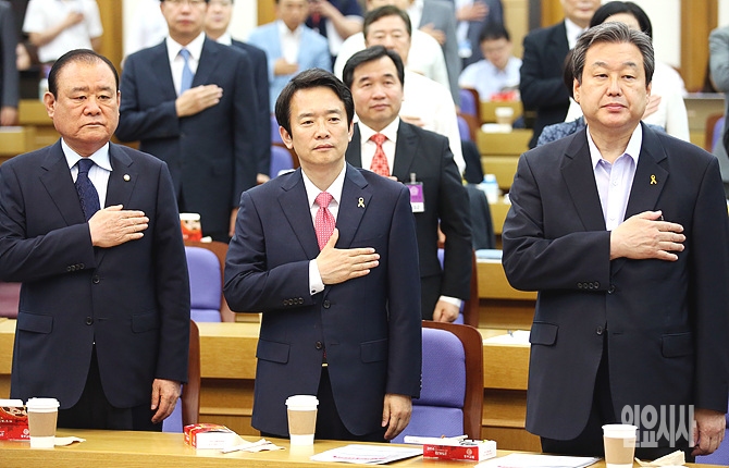 10일 오전, 서울 여의도 국회에서 열린 경제통일교실에서 송광호·김무성·남경필 의원 등 참석자들이 본 일정 직전, 국민의례를 하고 있다.