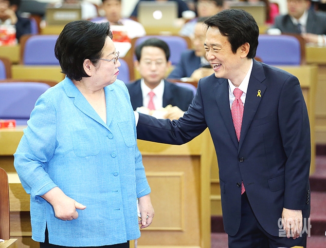 10일 오전, 서울 여의도 국회에서 열린 경제통일교실에서 새누리당 남경필 경기도지사 당선자가 같은 당 김을동 의원과 이야기하며 활짝 웃고 있다.