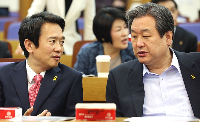 10일 오전, 서울 여의도 국회에서 열린 경제통일교실 도중 김무성 의원이 남경필 경기도지사 당선인과 이야기를 나누고 있다.