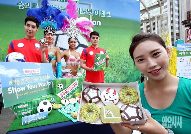 크리스피 크림 도넛이 10일 서울 광화문 일민미술관 앞에서 '축구공', '코너킥', '파이팅', '삼바 스프링클' 등 월드컵 승리 기원 신제품 싸커 도넛 4종을 선보이고 있다.