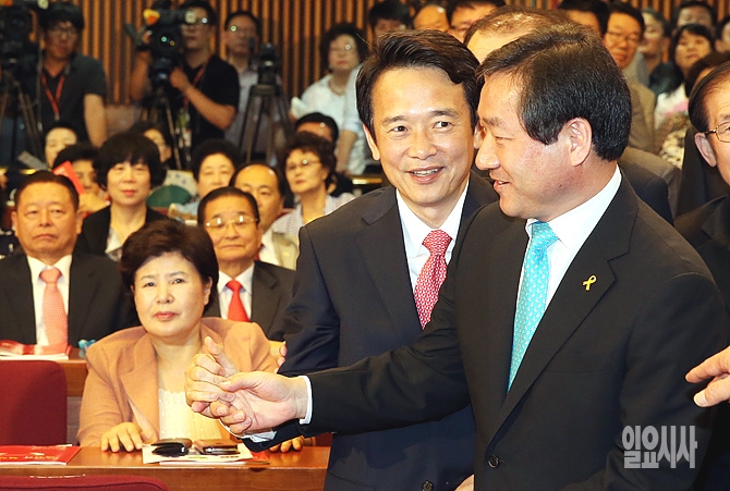 10일 오전, 국회 헌정기념관에서 열린 '새누리당의 변화와 혁신의 길' 토론회에 유정복 인천시장·남경필 경기도지사 당선인이 참석해 기쁨을 나누고 있다.