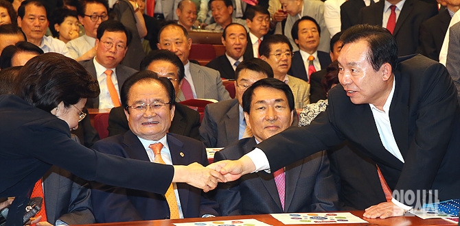 10일 오전, '피닉제'(불사조와 이인제의 합성어)로 불리는 새누리당 이인제 의원(사진 오른쪽)이 서울 여의도 헌정기념관에서 열린 서청원 의원 주최의 '새누리당의 변화와 혁신의 길' 토론회에 참석해 다른 참석자와 악수를 나누고 있다.