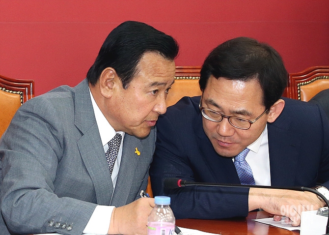 10일, 서울 여의도 국회에서 열린 새누리당 비상대책회의서 이완구 비대위원장 겸 원내대표(사진 오른쪽)가 주호영 정책위의장과 이야기를 나누고 있다.