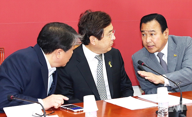 10일, 서울 여의도 국회에서 열린 새누리당 비상대책회의서 이완구 비대위원장 겸 원내대표(사진 오른쪽)가 세월호 국조 일정과 관련해 심재철 국조특위위원장-김재원 원내수석부대표와 이야기를 나누고 있다.