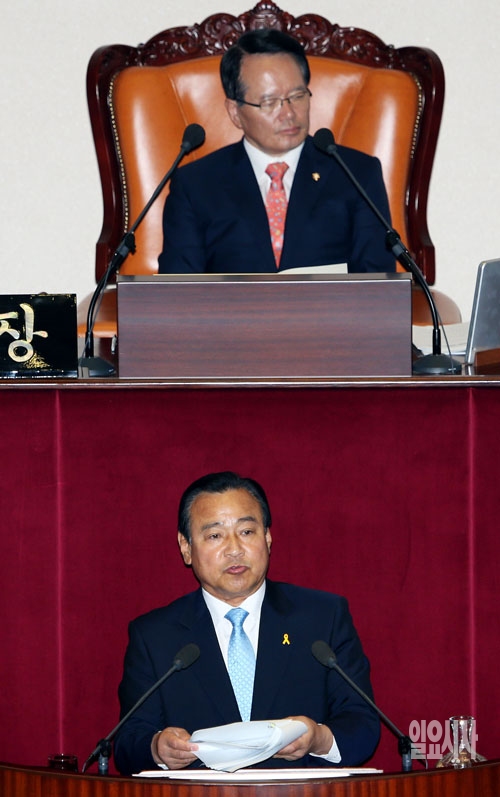 이완구 새누리당 원내대표가 11일 서울 여의도 국회에서 열린 본회의에서 교섭단체 대표 연설을 하고 있다.