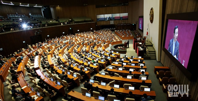 이완구 새누리당 원내대표가 11일 서울 여의도 국회에서 열린 본회의에서 교섭단체 대표 연설을 하고 있다.