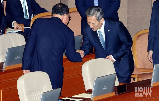 김관진 국방안보실장 겸 국방부 장관(오른쪽)이 11일 서울 여의도 국회에서 열린 본회의에 참석해 정홍원 국무총리와 인사하고 있다.