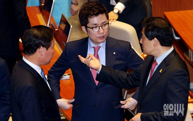 김상민 새누리당 의원(가운데)이 11일 서울 여의도 국회에서 열린 본회의에서 동료의원들과 이야기를 나누고 있다.