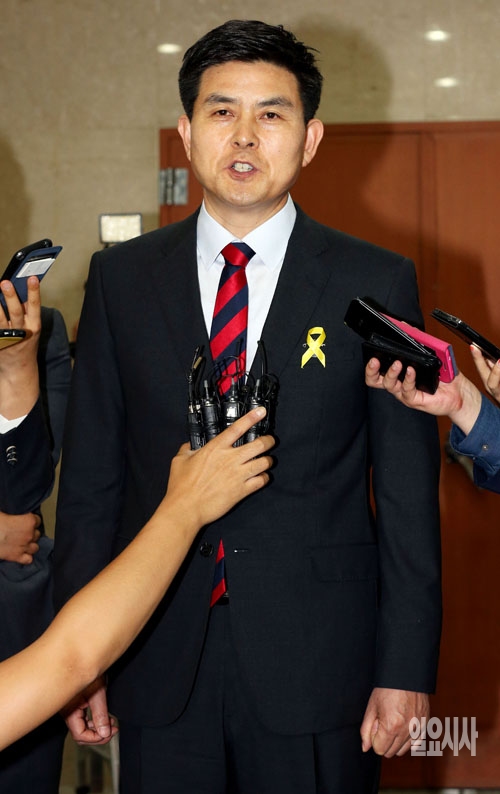 김태호 새누리당 의원이 11일 서울 여의도 국회 정론관에서 7·14 전당대회 출마 선언 기자회견을 마친 뒤 취재진의 질문에 답하고 있다.