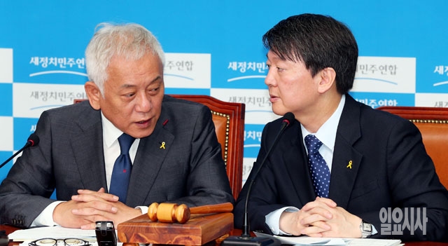김한길(왼쪽), 안철수 새정치민주연합 공동대표가 11일 서울 여의도 국회에서 열린 최고위원회의에서 대화를 나누고 있다.