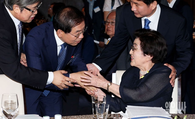 박원순 서울시장(왼쪽)과 이희호 여사가 12일 서울 여의도 63시티 그랜드볼룸에서 열린 6·15남북정상회담 제14주년 기념식에서 인사를 나누고 있다.