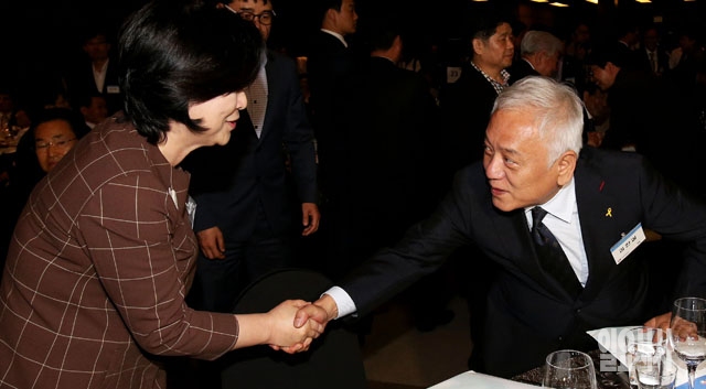 김한길 새정치민주연합 공동대표(오른쪽)와 심상정 정의당 원내대표가 12일 서울 여의도 63시티 그랜드볼룸에서 열린 6·15남북정상회담 제14주년 기념식에서 인사를 나누고 있다.