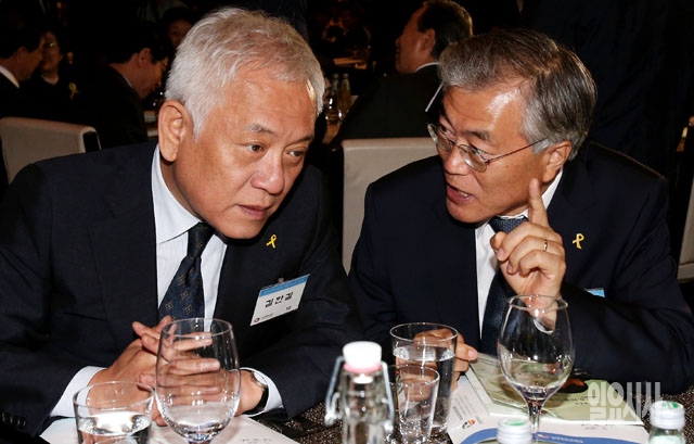 김한길 새정치민주연합 공동대표(왼쪽)와 문재인 의원이 12일 서울 여의도 63시티 그랜드볼룸에서 열린 6·15남북정상회담 제14주년 기념식에서 이야기를 나누고 있다.