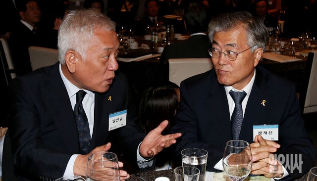김한길 새정치민주연합 공동대표(왼쪽)와 문재인 의원이 12일 서울 여의도 63시티 그랜드볼룸에서 열린 6·15남북정상회담 제14주년 기념식에서 이야기를 나누고 있다.