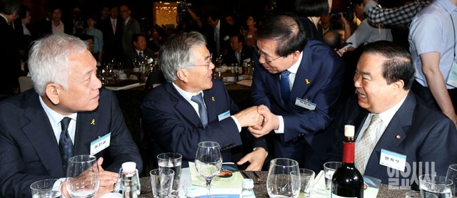 박원순 서울시장(오른쪽에서 두번째)과 문재인 새정치민주연합 의원이 12일 서울 여의도 63시티 그랜드볼룸에서 열린 6·15남북정상회담 제14주년 기념식에서 인사를 나누고 있다. 사진 왼쪽부터 김한길 공동대표, 문 의원, 박 시장, 문희상 의원.