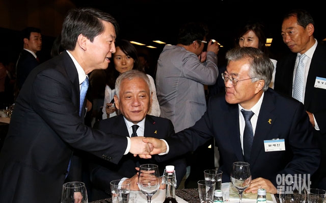 안철수 새정치민주연합 공동대표(왼쪽)와 문재인 의원이 12일 서울 여의도 63시티 그랜드볼룸에서 열린 6·15남북정상회담 제14주년 기념식에서 인사를 나누고 있다.