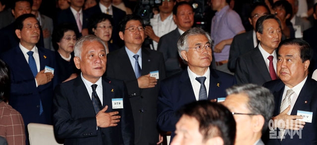 김한길 새정치민주연합 공동대표와 문재인 의원을 비롯한 참석자들이 12일 서울 여의도 63시티 그랜드볼룸에서 열린 6·15남북정상회담 제14주년 기념식에서 국기에 대한 경례를 하고 있다.