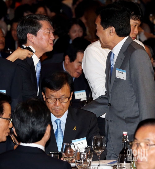 안철수 새정치민주연합 공동대표(왼쪽)와 손학규 상임고문이 12일 서울 여의도 63시티 그랜드볼룸에서 열린 6·15남북정상회담 제14주년 기념식에서 인사를 나누고 있다.