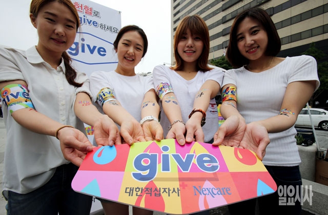 세계헌혈자의 날을 하루 앞둔 13일 서울 광화문광장에서 대한적십자사와 한국쓰리엠의 넥스케어가 나눔과 헌혈의 의미를 보다 즐겁게 느끼고 참여할 수 있는 '기브(give) 캠페인'을 벌이고 있다.