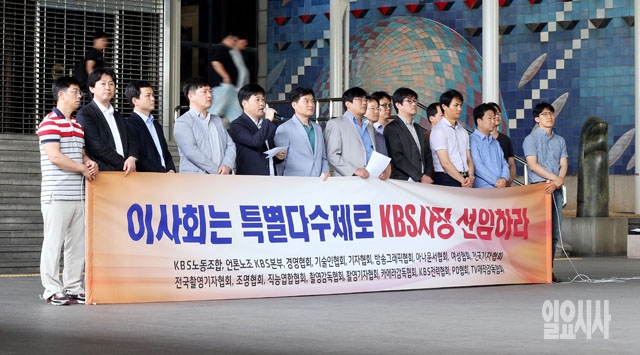 KBS 양대노조 및 직능협회 지도부가 16일 서울 여의도 KBS 신관앞에서 KBS 사장 선임 관련 이사회의 특별다수제 채택과 사장추천위원회 구성을 촉구하는 기자회견을 갖고 있다.