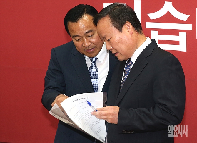 16일 오후, 조윤선 청와대 신임 정무수석이 서울 여의도 국회 새누리당 원내대표실을 찾은 가운데, 이완구 원내대표와 김재원 원내수석부대표가 여야 간 합의사항을 확인하고 있다.