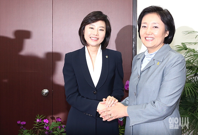 16일 오후, 조윤선 청와대 신임 정무수석(사진 왼쪽)이 서울 여의도 국회 새정치민주연합 원내대표실을 찾아 박영선 원내대표를 예방하고 있다.
