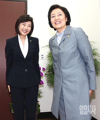 16일 오후, 조윤선 청와대 신임 정무수석(사진 왼쪽)이 서울 여의도 국회 새정치민주연합 원내대표실을 찾아 박영선 원내대표를 예방하고 있다.