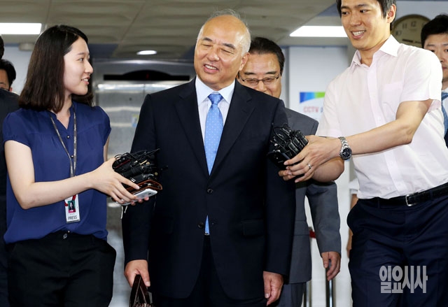 문창극 국무총리 후보자가 16일 오후 서울 종로구 정부서울청사 창성동 별관에서 퇴근을 하며 취재진의 질문에 답하고 있다.