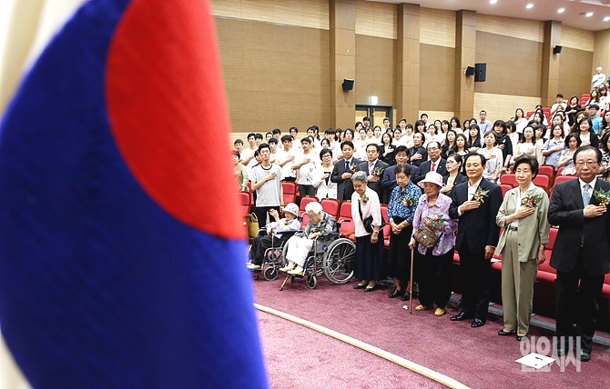 16일 오후 서울 여의도 국회 의원회관에서 노철래 의원실 주최로 열린 뮤지컬 '꽃신' 제작보고회 직전, 참석자들이 국기에 대한 경례를 하고 있다.