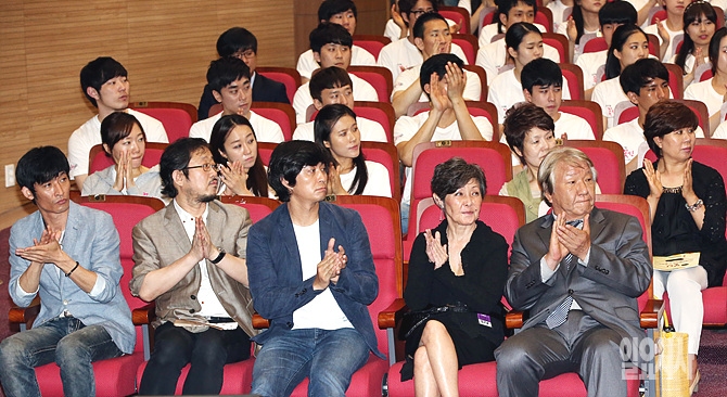 16일 오후 서울 여의도 국회 의원회관에서 노철래 의원실 주최로 열린 뮤지컬 '꽃신' 제작보고회 직전, 탤런트 김진태(사진 오른쪽), 뮤지컬배우 겸 가수 윤복희(사진 오른쪽 두 번째) 등 관계자들이 박수를 치고 있다.