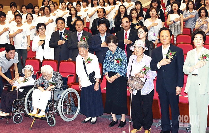 16일 오후 서울 여의도 국회 의원회관에서 노철래의원실 주최로 열린 뮤지컬 '꽃신' 제작보고회에서 참석자들이 국기에 대한 경례를 하고 있다.